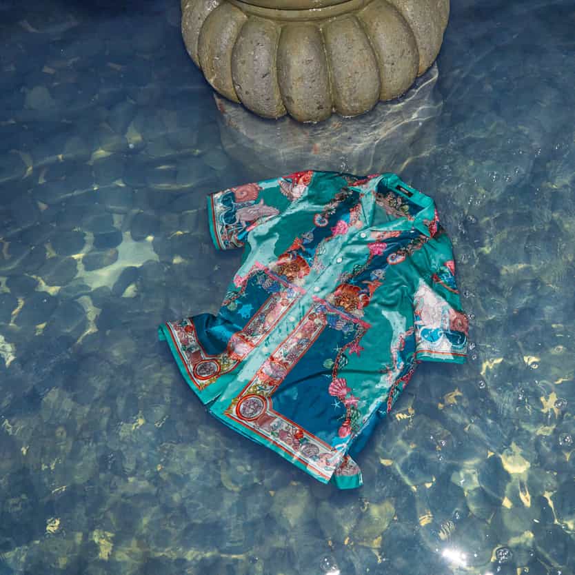 This season, the Versace woman moves effortlessly between beach and boulevard. Draped swimwear evolves into structured bustiers; lightweight pareos become sheer, buttoned dresses. Signature cowl necklines flow into liquid silhouettes, accented with the iconic safety pin. Across poplin, jersey and silk, the House’s emblematic prints reappear—reimagined in airy cardigans, fluid shirts and sculptural jackets.