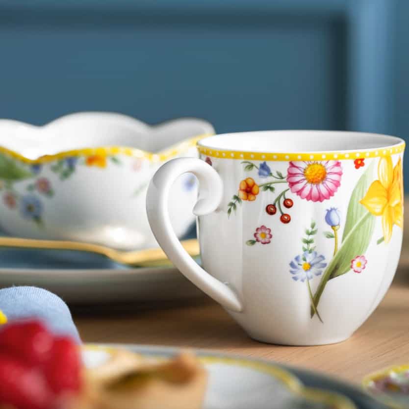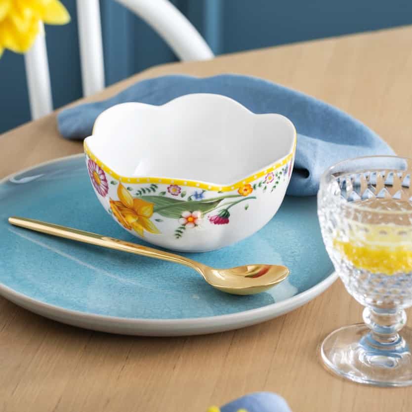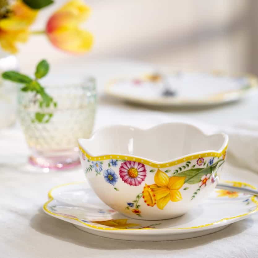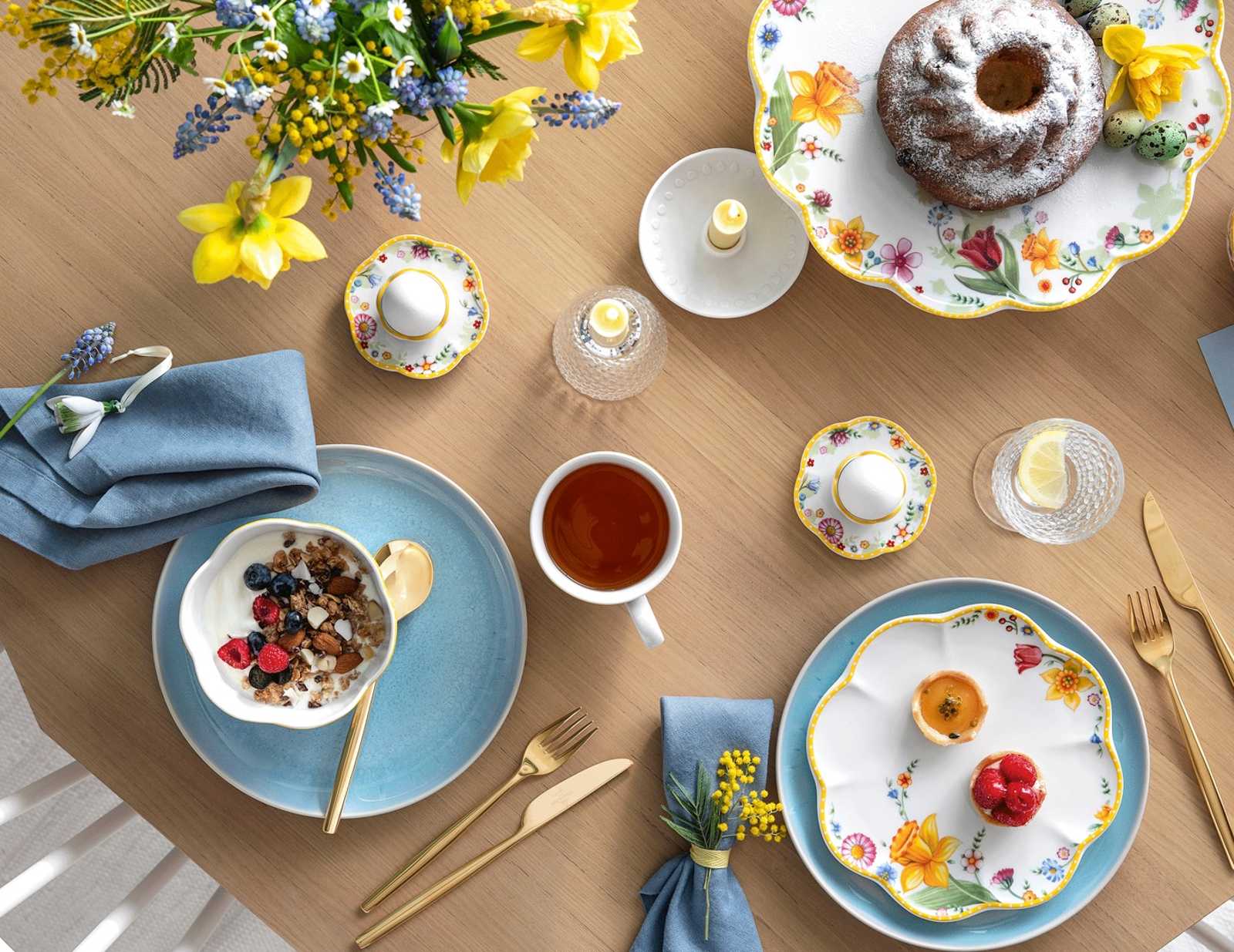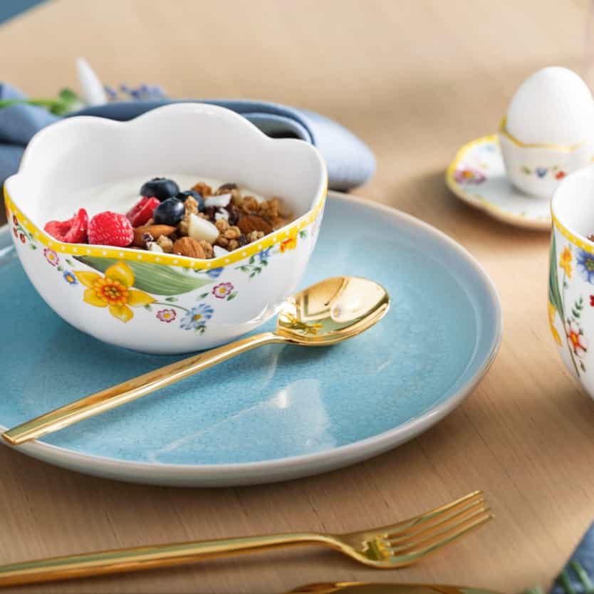 Let yourself be inspired by the splendor of spring and create an enchanting Easter table with Spring Awakening and Crafted Blueberry. The classic Spring Awakening crockery captures the beauty of daffodils and grape hyacinths, while the modern elements of Crafted Blueberry in soft blue set harmonious accents. This combination creates a festive yet light atmosphere that will delight your guests. Complete the ensemble with color-coordinated napkins and small decorative elements for a perfectly harmonious table.