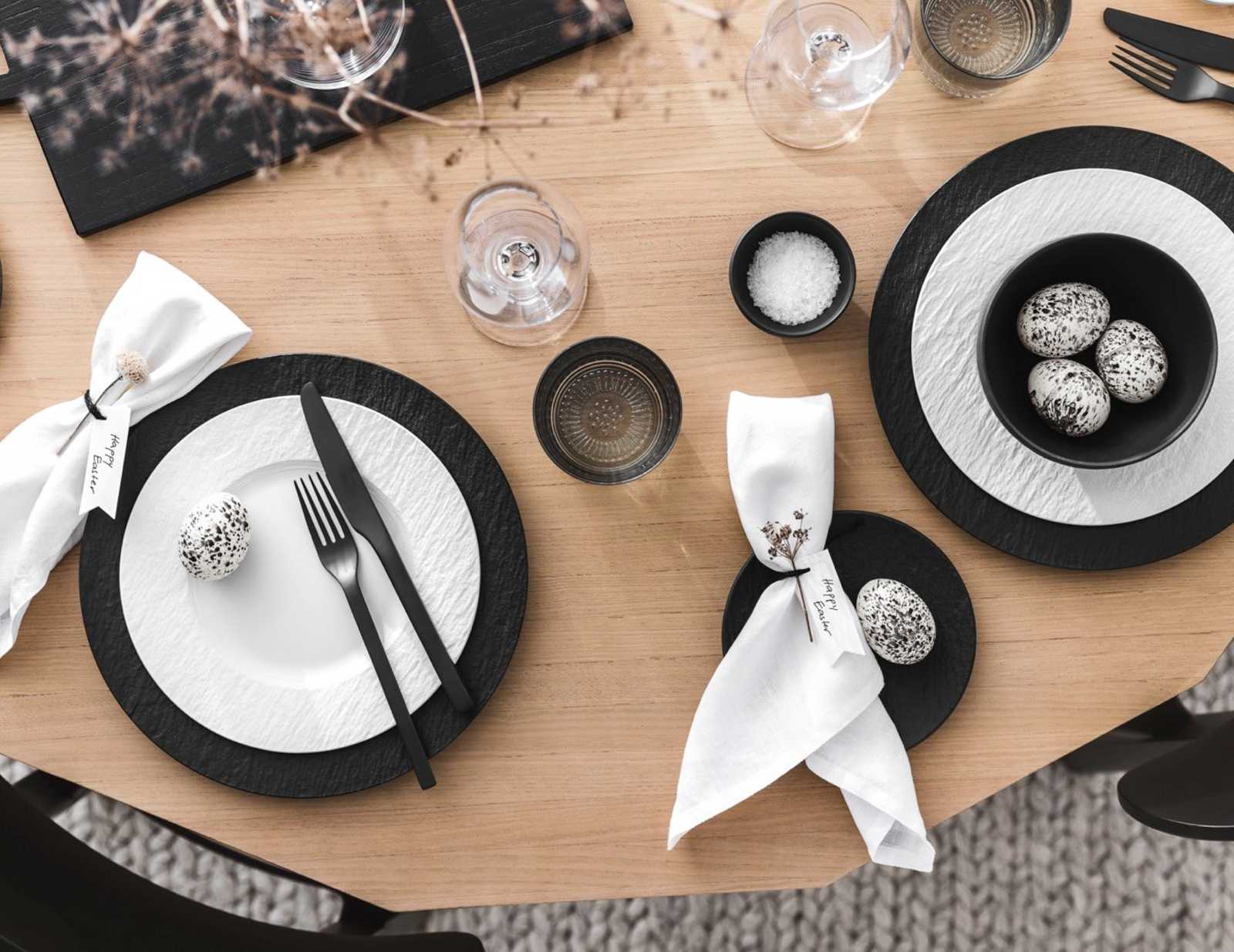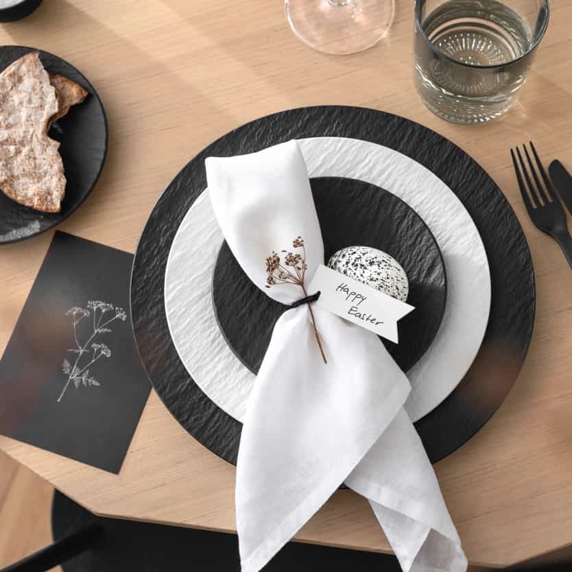 Want a modern table decoration for Easter? Create impressive contrasts with black and white plates from our Manufacture Rock collection. An arrangement of dried twigs and flowers as well as white cloth napkins will enhance the look of your modern Easter table. Tip: Shape the napkins into little ears.