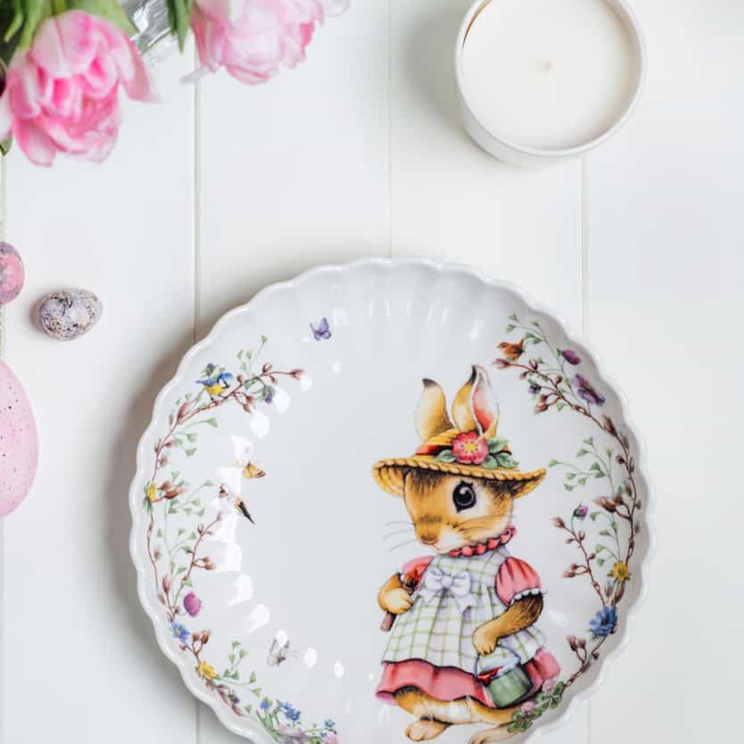 Not everyone likes it truly colourful and playful. But you don't want to completely forego Easter motifs either? The cheerful, colourful bunny motifs of the Spring Fantasy collection create a beautiful contrast to the subtle pastel colours and blossoms. Tulips or an Easter branch with small decorative hangers are suitable as floral decoration.