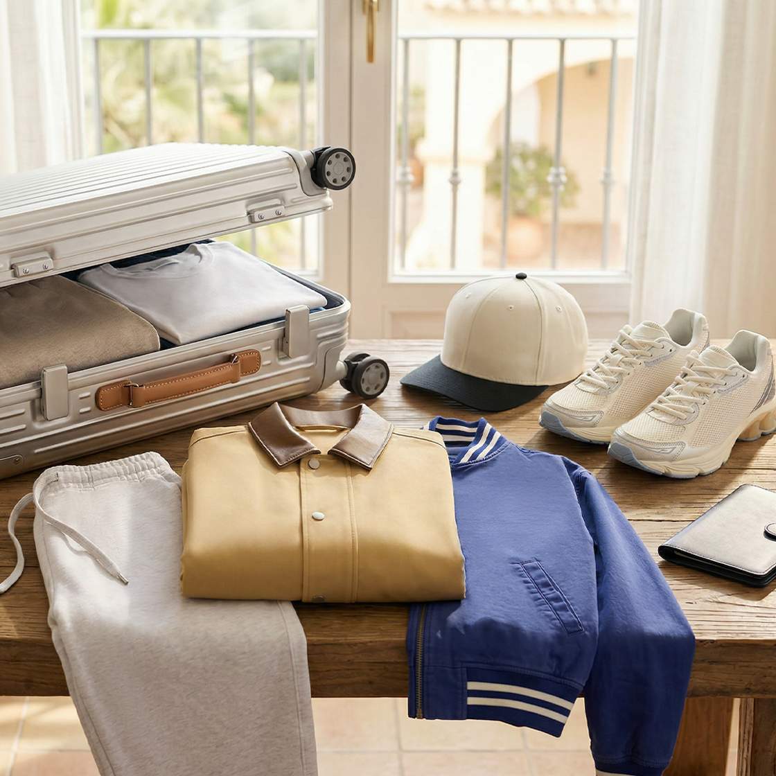 The holiday starts in the airport lounge. So get travel-fit-ready with up to XX% off at [Brand], [Brand] and more. We’re thinking brushed fleece joggers and an oversized varsity jacket, or maybe loose jorts and a versatile bomber. Head to [Brand] for new trainers, from retro runners to chunky pairs. And don’t forget our large array of luggage options to suit your preferences. Finally, go all out with a statement-making carry-all bag from [Brand].